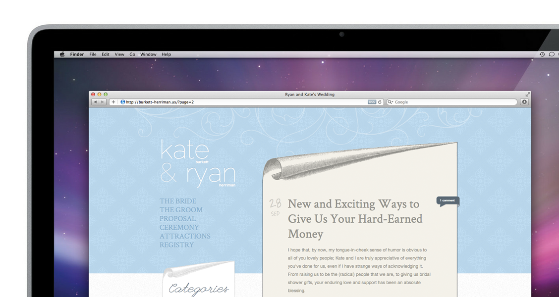 My friend Ryan is a web developer, and had been working on a simple content management system built on Django when he and Kate became engaged.